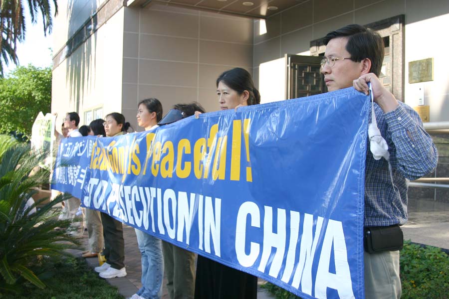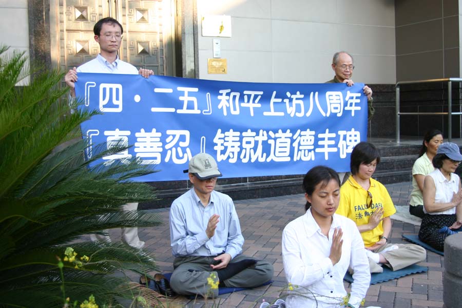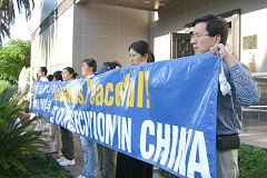 ![]() 休士顿法轮功学员中领馆前纪念“四·二五”,抗议迫害 |