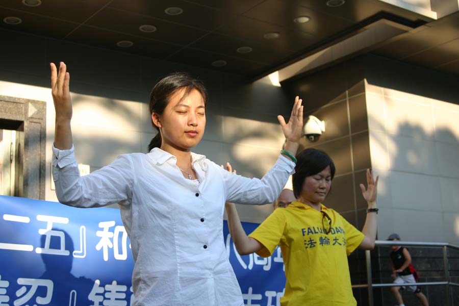 法轮功学员彭女士说:“八年前四•二五法轮功学员和平理性上访,获得国际舆论的赞扬,今天我们来中领馆前纪念四•二五八周年,也悼念被中共迫害致死的、被活体摘取器官的大陆同修。呼吁国际社会关注,共同制止这场迫害。”