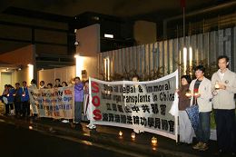 二零零七年四月二十五日,日本关东地区的法轮功学员来到中使馆,举行烛光守夜活动,纪念八年前中国法轮功学员“四•二五”万人和平上访,抗议中共对法轮功的迫害,要求立即惩办发动迫害的元凶江泽民及罗干、周永康、刘京等人。
