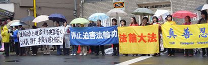二零零七年四月二十五日,日本近畿地区的部份法轮功学员冒雨在中国驻日本大阪总领事馆前集会,纪念“四•二五”法轮功学员和平上访八周年。