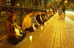 二零零七年四月二十五日傍晚,乌克兰法轮功学员聚集在首都基辅中使馆前,举行烛光守夜活动,纪念八年前中国法轮功学员“四•二五”万人和平上访,悼念被中共迫害失去生命的中国大陆同修,抗议中共对法轮功的迫害,强烈呼吁制止中共对法轮功学员实施的群体灭绝罪。