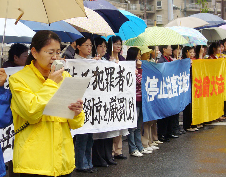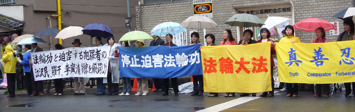 虽然当日上午一直阴雨不断,学员们仍整齐的一字排开,手举“严惩迫害法轮功凶手江泽民、罗干、刘京、周永康”、“停止迫害法轮功”等中日文横幅,谴责中共邪党对法轮功持续至今的残酷迫害。集会者中有当年参加过“四•二五”大上访的老学员;有这次活动之前才刚刚知道“四•二五”意味着什么的新学员;有身孕八个月的主妇;也有八十多岁的老人。八年的反迫害历程中法轮功群体的和平理性、坚定正信的风貌已得到国际社会的公认。