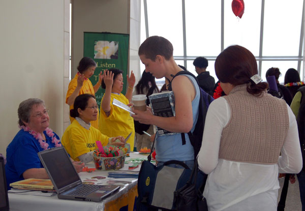 今年麻州大学在波士顿校区举办一年一度的健康展览会,正好是四月二十五日,法轮功学员和剑桥医疗中心、哈佛癌症中心、波士顿素食学会等三十多个团体一起参加。这是法轮功学员第四次参与该展览会。学员们在现场摆放法轮功教功录像、真相资料、免费教功、教褶纸莲花及现场功法示范,备受校园内师生欢迎。