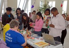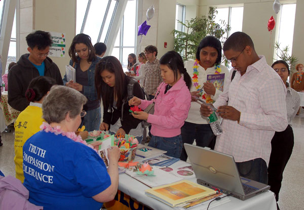在展览会大厅中,法轮功学员的展位最突出,周围总是挤着想听真相、想学功或想学褶纸莲花的人。麻州大学咨询中心的戴博拉·科恩(Deb Cohen)告诉法轮功学员说;“我注意到你们的摊位人来人往,络绎不绝,我也想了解法轮功。”