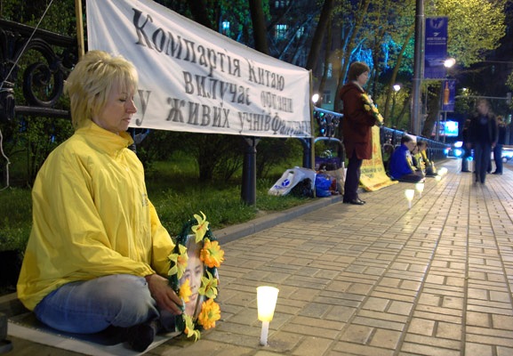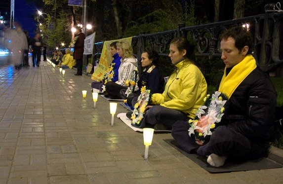 【明慧网二零零七年四月二十八日】二零零七年四月二十五日傍晚,乌克兰法轮功学员聚集在首都基辅中使馆前,举行烛光守夜活动,纪念八年前中国法轮功学员“四•二五”万人和平上访,悼念被中共