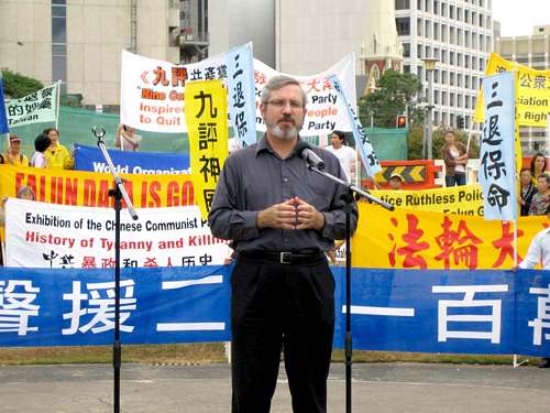 国家民事委员会(National Civic Council) 代表弗兰斯(Ken Francis)表示,他很高兴能代表国家民事委员会来参加声援退党的集会,他呼吁中共立即停止虐杀及对人权迫害的行为,让中国人民拥有和平。他说,两千一百万人退党意味着中共政权正在解体之中;而对于法轮功所遭受的迫害,弗兰斯表示他们非常的支持法轮功,他相信迫害一定会结束,人权一定会战胜邪恶。同时,他也指出,中国现在仍信仰的马克思主义早已无人相信,那套主义利用人民,只顾自己的私利。他祝福关心人权的与会者要持续努力直到中共垮台。
