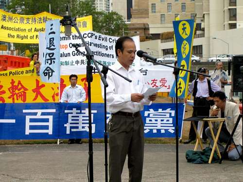 首先发言的是昆士兰自由中国协会代表李先生,他表示:“当一百万人退出中共时,我们曾在这里举行集会,那时我们需要向人们解释很多,因为他们并不知道在中国发生的事。然而今天有两千一百万人退出中共党、团、队,我不需要说太多,因为这个数字(退党)已经说明一切。今天,我们替那些已经脱离中共的人们感到高兴,但同时也为大部份还没退党的中国人感到担忧,因为他们从小就被中共洗脑,一直跟从中共,没有自己的思想。所以他们才会犹豫到现在。中国朋友们,选择脱离中共,您的未来会十分美好。中共现在有如将要沉没的船,和它有关的一切都将随它一同下沉。但如今您有选择的机会,再跨出一步您就自由了,就得救了,请您尽快退党。”