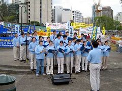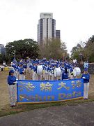 由法轮大法学员组成,来自悉尼的天国乐团及天歌合唱团也特地为支持本次活动来到了布里斯本演出。天国乐团嘹亮的鼓声及乐声响彻云霄,为庆祝活动壮大声势,引来了不少注目的眼光。他们分别演奏了“法轮大法好”,“法正乾坤”及“法鼓法号震十方”三首乐曲。天歌合唱团演唱了“滚滚退党潮”和“世界需要真善忍”两首歌曲,深深感动现场民众。