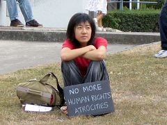 ![]() 悉尼天歌合唱团 | ![]() 陈姓女大学生自制“结束人权暴行”看板,静静的聆听演讲。 |