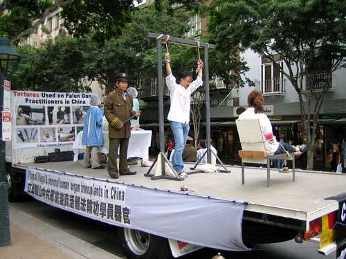 ![]() 真人模拟的反酷刑展,揭露中共迫害法轮功暴行 | ![]() 行人被游行队伍吸引,争相拍摄 |
