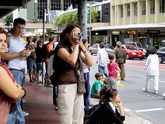 游行中,路上的行人们被阵容庞大的队伍,包括真人模拟的反酷刑展、天国乐队、腰鼓队、以及揭露和谴责中共暴行的横幅标语所震惊。许多人停下来观看和询问,并纷纷拿出相机和摄像机拍摄。