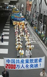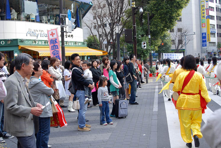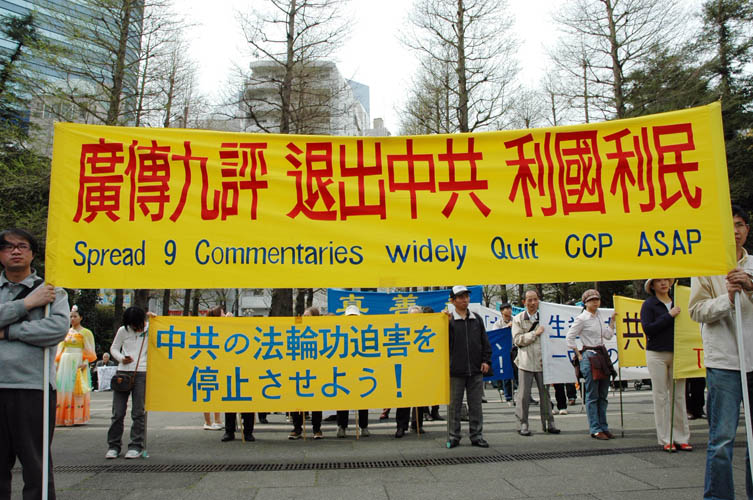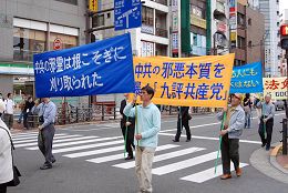 集会后,声援者穿越游客聚集的池袋及新宿区举行了约两小时的游行。游行队伍从池袋出发穿过市区至高田马场,队伍中有腰鼓队开道,队伍后面仙女压阵,引来沿途大量市民驻足观望,部份大陆游客更对公开谴责中共感到高兴,另有了解退党重要性后当场表示退党的游客。