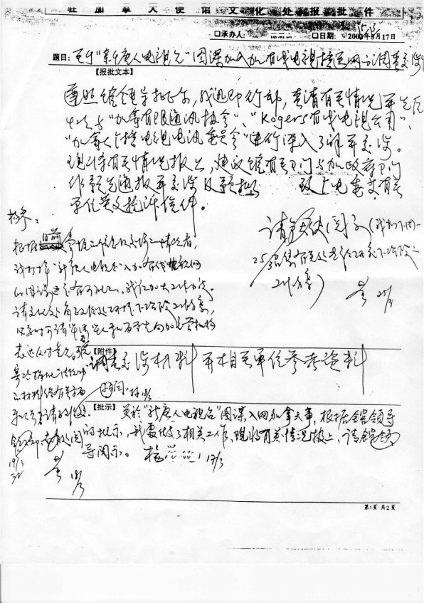 第一个有黄(惠康)签名的备注是二零零三年三月二十五日黄手写的,“遵照馆领导批示,我迅即行动,查清有关情况并先后与‘加拿大有线通讯学会’、‘Rogers有线电视公司’、‘加拿大广播电视电讯委员会’进行深入了解并交涉。现将有关情况报上,建议馆有关部门与加政府部门做预先通报并交涉,及预拟致广电委等有关单位英文抗议信件。”