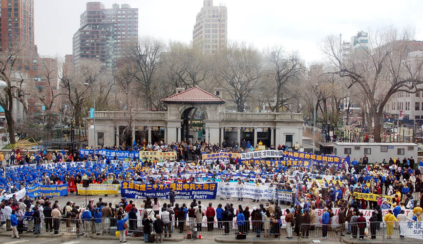 游行从百老汇大道的三十九街开始,到十四街联合广场结束,历时两个小时,接着在联合广场继续祝贺两千万退党潮的大集会。整个游行队伍浩浩荡荡,绵延十六个街口,一眼望去,不见头尾。