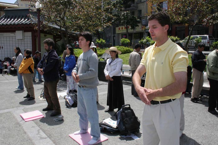 来旧金山旅游的Julie和Karen被法轮功学员祥和的炼功场面所感染,他们表示看到法轮功学员炼功,感到很舒服,他们说知道法轮功是一种精神修炼,在中国受到迫害。但不明白为什么中共要迫害法轮功。