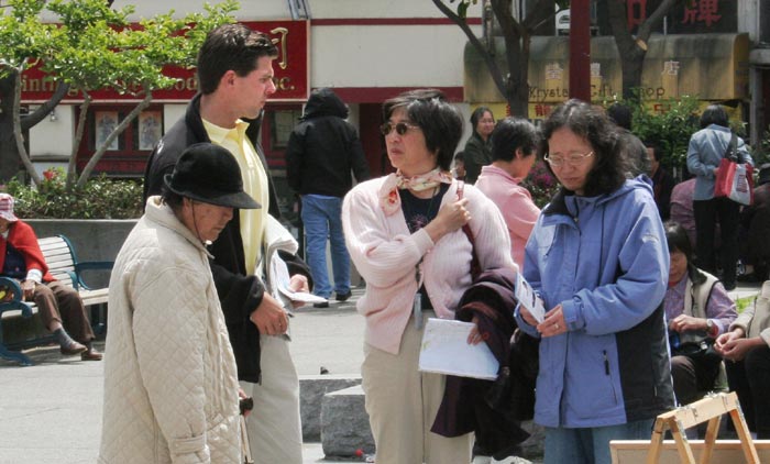 旧金山中国城花园角广场是法轮功学员经常来炼功、讲真相的地方。当天,一些学员在炼法轮功功法,其他的学员向游客讲述法轮功的真相。有的人看到学员炼功的姿势跟着比划着学,有的游客表示要在媒体上将迫害讲出来。