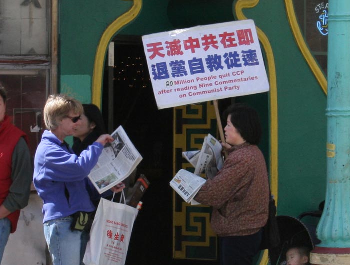![]() 法轮功学员在中国城主要街道派发资料 |