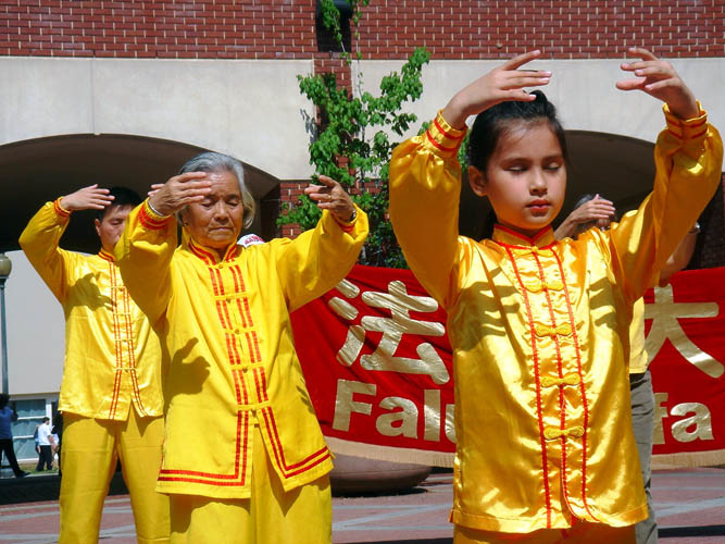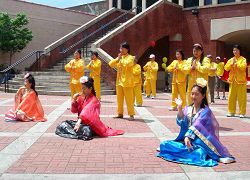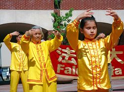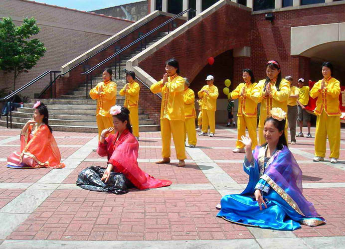 四月的格林威利春风和煦、丽日融融,在市中心Bergamo广场上国际太极气功节正式开始。法轮功功法被安排在第一个和最后一个出场表演。法轮功学员的方阵第一排为身着仙女装者演示静功打坐,其后三排为身着金黄色炼功服者演示动功。中午暖暖的阳光照射在金黄色的炼功服上,与大法弟子的超然神采交相辉映。