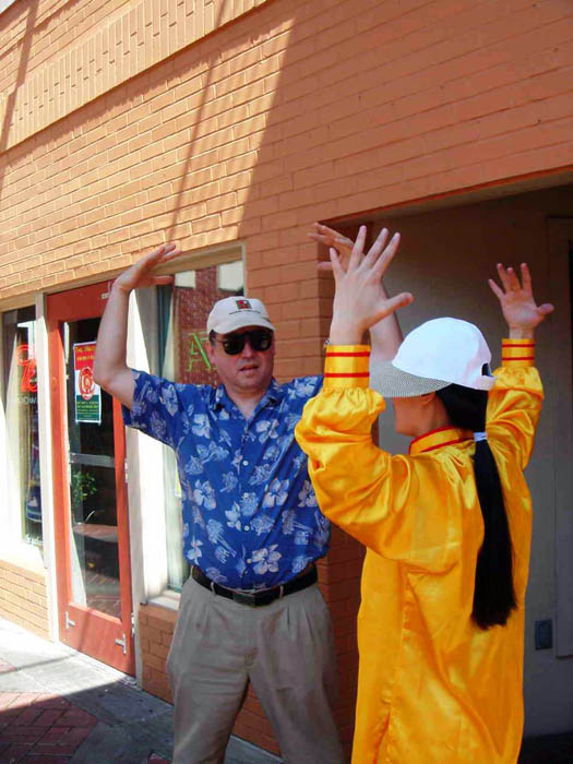 所谓“外行”看热闹,“内行”看门道。虽然法轮功动作简单,但是修炼者散发的“能量场”非常强大。很多对太极气功感兴趣者对能量场比较敏感,可以强烈的感受到;有的则感觉到修炼者举手投足间的祥和、亲切与美好。一边是法轮功在演示功法,另一边就有旁观者喜欢跟着学;更有几位西方人在认真看过法轮功的介绍传单之后,直接来到法轮功学员的摊位购买《转法轮》,并表示要学习法轮功。