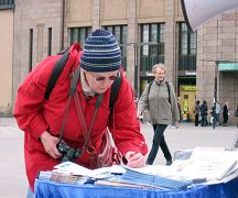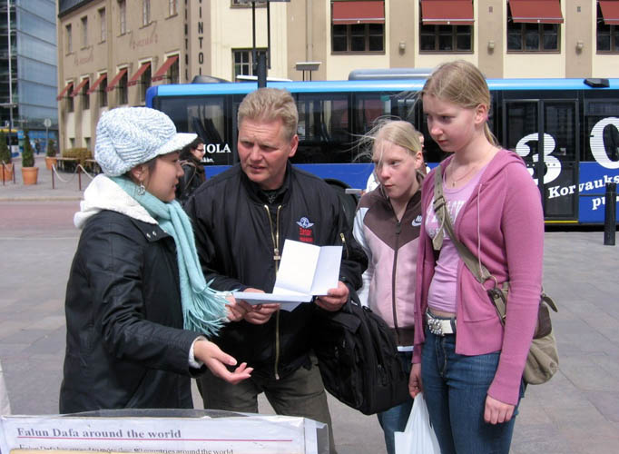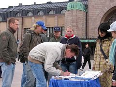 二零零七年四月二十八日,学员们又一次来到火车站旁,向人们讲述中共邪党八年来对法轮功学员的残酷迫害真相,并呼吁芬兰政府和民众帮助营救一个月前在中国武汉市被中共“六一零”办公室绑架的中国留学生Sunny的父亲张伟杰。法轮功学员请想提供帮助的民众将一封呼吁营救张伟杰的信亲手寄给芬兰政府总理和议员。只见很多人仔细的阅读了有关张伟杰被迫害的详情和声援信后,主动向学员索取已准备好的信件,当场签名并表示会立即将信发出;更有的人索要多封信,要请他们的亲朋好友共同参与。在一旁的Sunny不断的向人们道谢。