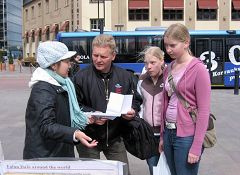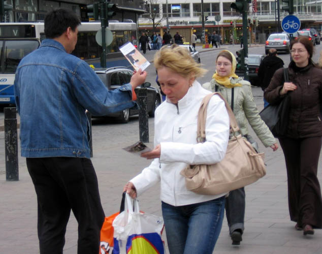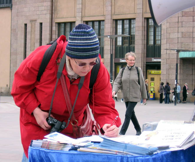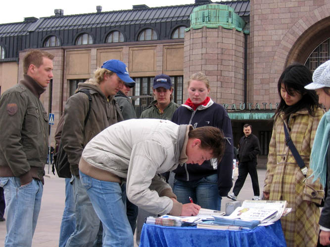 【明慧网二零零七年五月一日】“我能做些什么?芬兰政府做了什么?”芬兰法轮功学员周末在赫尔辛基火车站旁洪法讲真相中,经常会听到明白了真相的人们这样问。