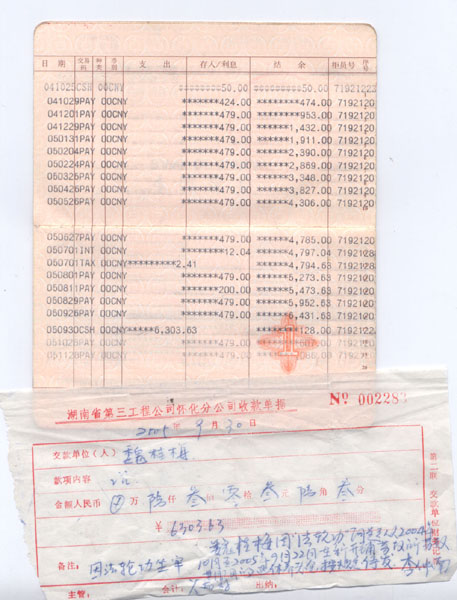 二零零零年至二零零四年,魏桂梅因讲真相、发资料被非法劳教两次,在被劳教迫害期间,本应该发给魏桂梅的内退生活费,被怀化三公司无理扣押,总共6303.63元(见下图收据)。