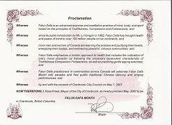 二零零七年五月七日,加拿大不列颠哥伦比亚省克兰布鲁克市市长罗斯•普莱斯特褒奖二零零七年五月为“法轮大法月”。