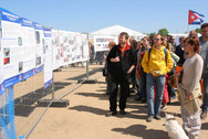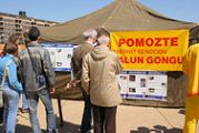 在捷克法轮大法学会的帐篷前,学员模拟演示了中共用以迫害法轮功的酷刑。一位女士非常认真的观看酷刑演示,这场景深深触动了她。她的表情很痛苦,对学员说,“在(捷克斯洛伐克)共产党时期我也被关进监狱,但没有承受这种折磨。”