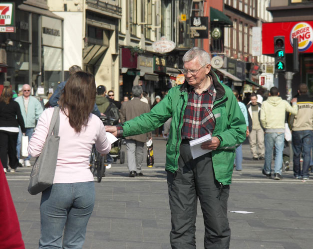 不久,一九九九年七月,在中国发生了那场邪恶的对法轮大法的迫害。从那以后,鲍尔天天奔忙在反迫害、讲真相、救度世人的行列中。鲍尔与其他法轮大法弟子一起,每天在中共使馆门前抗议迫害,无论风吹日晒,寒冬腊月。这一做就是四年多。四年以来,到中使馆来的人,走过他身边看到真相图片、或者得到他的一份真相资料的有缘人,不计其数。