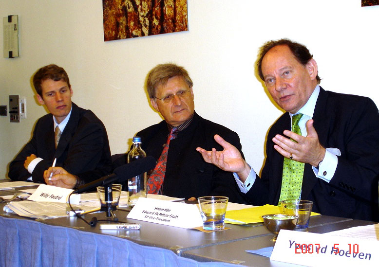 由国际人权协会、人权无疆界、及比利时法轮大法协会等八家来自欧洲的非政府人权组织协办的人权讨论会,于二零零七年五月十日在布鲁塞尔欧盟总部旁的斯肯伯雷蒙酒店举行,研讨会呼吁欧盟在零八年北京奥运会之前采取行动,保证中国人权的改善。欧洲议会副主席麦克米兰•史考特亲临会场,并在发言中称中共犯下的最大的错误就是打击信仰。