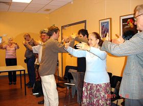 考虑到一些有视觉障碍的盲人,法轮功学员卡门(Kamen)教功时,就尽量用详尽的语言描述动作,对动作不准确的人再个别纠正。法轮功学员教的认真,人们学的认真,常常问是不是这样?法轮功学员总是耐心的帮助他们。学员每演示一套新的动作时,人们总要报以热烈的掌声。当法轮功学员询问他们累不累,要不要继续时,他们一致回答要继续。后来得知其中一位穿浅粉衣服的老人已经有一百岁了。