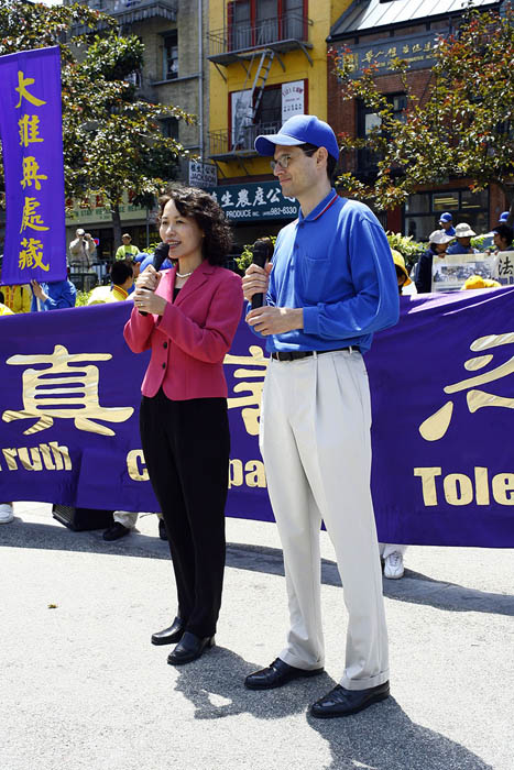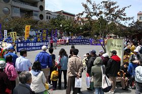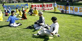 游行完毕后,法轮功学员在中国城花园角集会,多位法轮功学员分享了他们修炼法轮功后,身、心受益的亲身经历,并有约十位西方法轮功学员合唱“法轮大法好”。