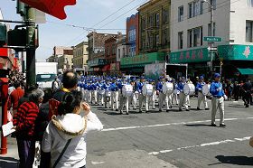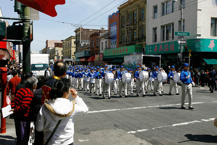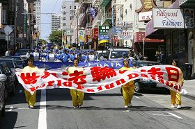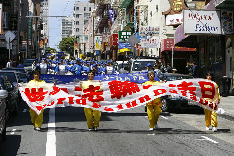 游行队伍环绕中国城一周,由上百名法轮功学员组成的天国乐队开道,演奏着《法轮大法好》、《法鼓法号震十方》和《法正乾坤》等歌曲,紧随着的队伍打出“5月13日─普天同庆世界法轮大法日”、“法轮大法好”、“世界需要真善忍”等彩色横幅;浩荡的队伍、响亮的鼓乐声,吸引了沿路许多行人和游客,他们中争相拿起照相机、或手机拍摄游行队伍,还有的鼓掌、喝彩。