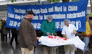 现场驻足观看的路人,对法轮功学员所揭示的迫害的残酷程度无不表示震惊,一位德国女士表示:“这太恐怖了,现在还有这种事发生。”