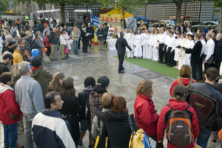 “为你而来”合唱团由爱好音乐的法轮功学员们组成,合唱团的表演者们衣着肃穆,神情庄严,他们用无伴奏的四部和声演唱了该团的经典曲目“为你而来”,赢得围观市民的阵阵掌声。