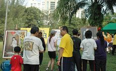 祥和的炼功音乐,加上缓、慢、圆的动功,吸引了许多晨运人士驻足观看。此外,真善忍画展作品亦深深的震撼着众市民。这些画作由修炼法轮功的艺术家创作,展现了大法修炼的美好,也揭露中共对法轮功的残酷迫害。看了这些图片,再听了法轮功学员的讲解,许多人纷纷表示中共对法轮功的迫害是残酷和不能容忍的。