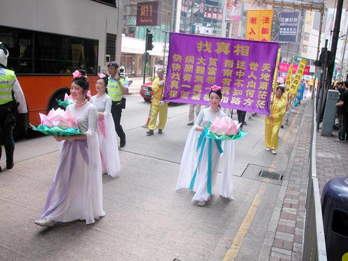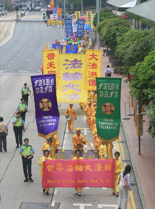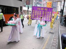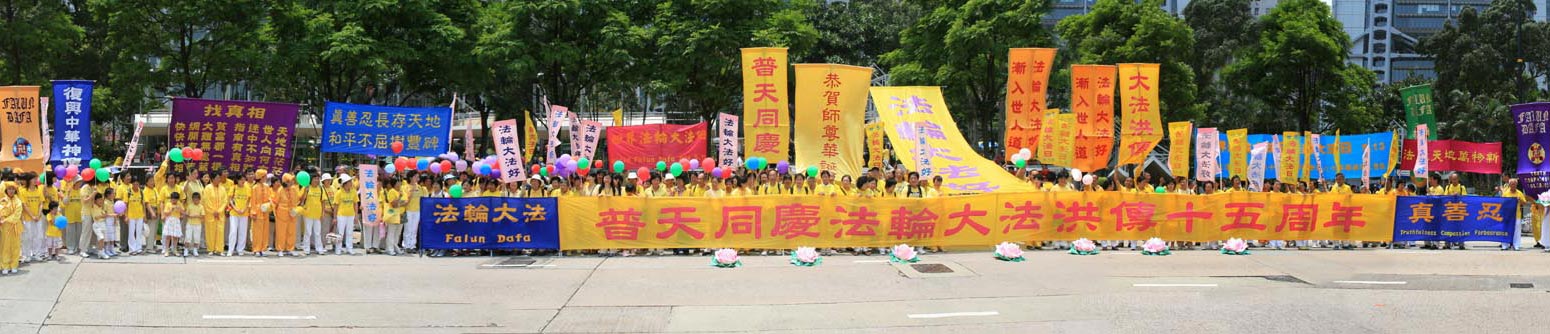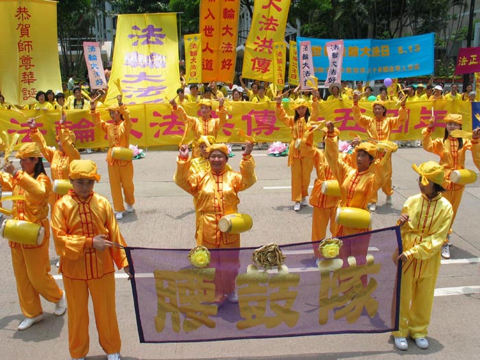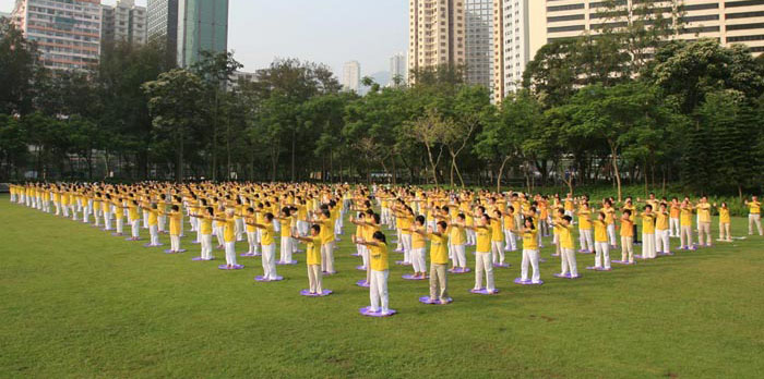 早上七时,在香港维多利亚公园,数百名身穿黄色炼功服的法轮功学员一行一行整齐的排列在草坪上集体炼功。晴朗的天空,青翠的草地,将身穿黄衣的修炼人衬托得更为醒目。炼功过后,上午十时,声势浩大的游行队伍在腰鼓队和大型横幅的引领下,途经港岛闹市前往中环,使沿途许多民众都感染到庄严而欢欣的气氛。