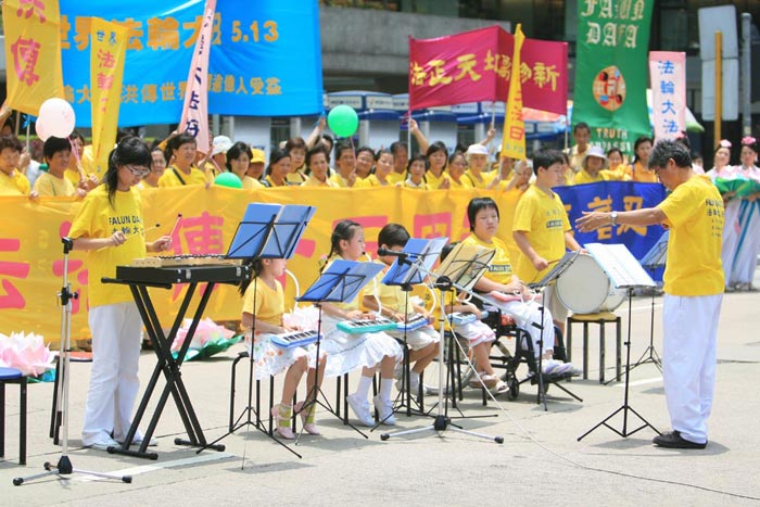 游行队伍到达终点的遮打道行人专用区后,学员整齐列队,高声祝贺师尊生日快乐,并高唱“法轮大法好”等歌曲。压轴为小弟子表演,几位小弟子背诵《洪吟》经文及表演器乐。整个活动除了庆祝法轮大法日及恭贺师尊华诞外,也向香港民众展现了法轮大法的风貌和美好。