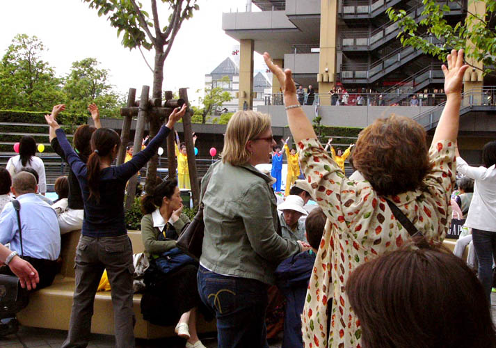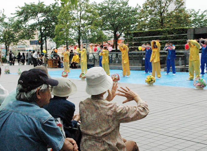 大法弟子的演出包括功法表演、舞蹈、歌曲、以及乐器演奏。在大法弟子演示功法时,许多观众模仿着学员的炼功动作。学炼动作的人们中,有一位六十岁左右的日本男士说,感觉自己的身体非常的舒服,有一股能量灌进自己身体。当他听到法轮功学员在中国遭到残酷迫害,感到非常的遗憾。