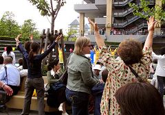 女王广场位于横滨市的中心,坐落于著名的横滨中华街附近,各种购物及游乐设施,吸引着大量的日本人与外国人来这里游览,观光。川流不息的人群今天都被大法弟子们丰富而精彩的演出所吸引,不由自主的停下脚步站在广场的四周观看表演。