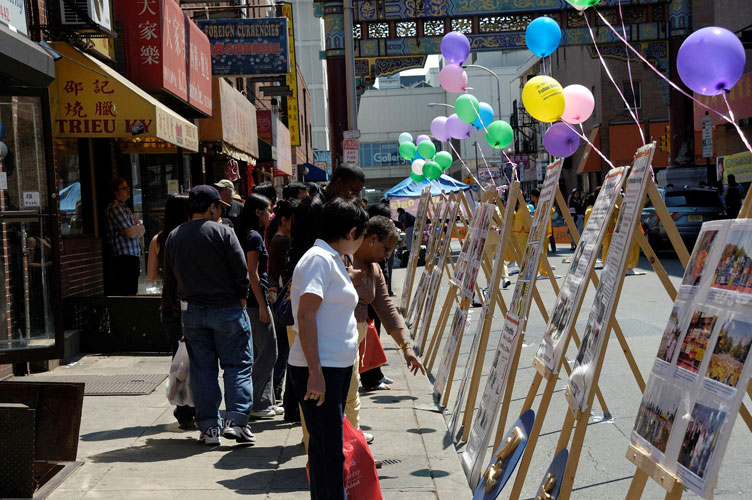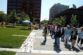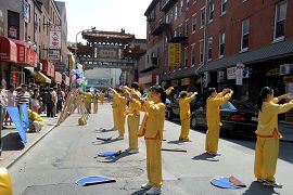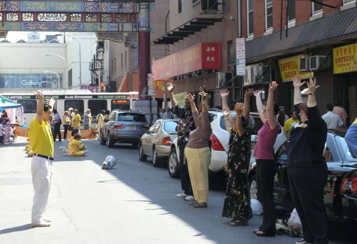 伴随着炼功音乐,数十位法轮功学员首次来到费城中国城演示功法,很多人在旁边观看,七、八个人当场跟着学炼。沿街面向人行道一字排开二十几块“正法之路”图片展,熙熙攘攘的行人无不驻足观看。一位法轮功学员还将家中的电视搬了来,播放《九评共产党》,一位过路华裔年轻人先是停下来观看,后来干脆坐在地下看了很长时间。