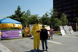 杨景端医生向人们介绍,他以前抽烟抽的很厉害,炼功后很快就戒掉了。在联邦政府社会安全局工作的菲尔·阮戴尔(Phil Randell)向人们讲述了他修炼法轮功后不久,原先患有的严重慢性疲倦综合症就神奇的好了。