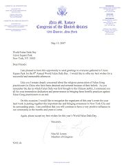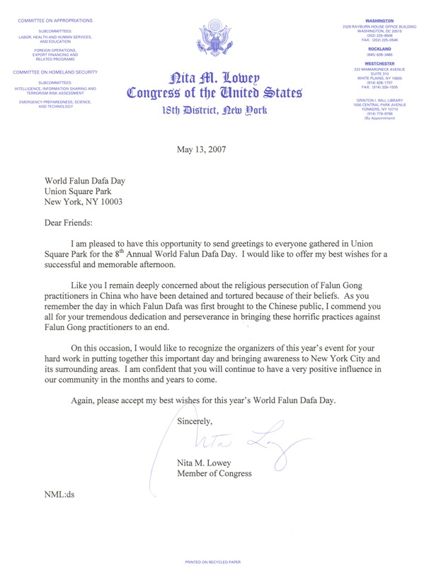 同你们一样,我非常关注在中国发生的对法轮功学员的迫害,他们因信仰而受到监禁和酷刑。当你们在纪念法轮大法开始在中国洪传之际,我对你们为制止对法轮功学员的暴行而做出的巨大努力和耐力表示赞赏。
