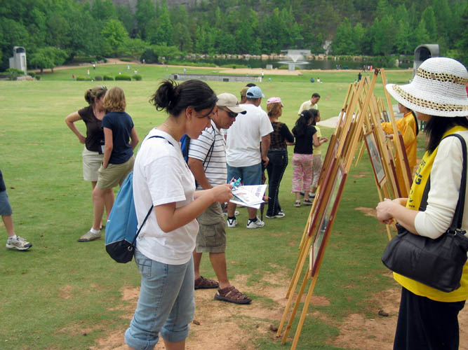 作为美东南的著名风景旅游胜地,这里周末的游人非常多。集体炼功的场景和真相展板吸引了很多游人。大家都被法轮功学员在中国无辜遭受的迫害而深深震惊,同时表达了对中共邪党的谴责和对法轮功的支持。更有多位游客被宁静祥和的修炼状态所吸引,当场学习功法。在石头山南北战争石刻前,在广阔的大草坪上,法轮功学员的炼功讲真相活动成为一道新的风景线。