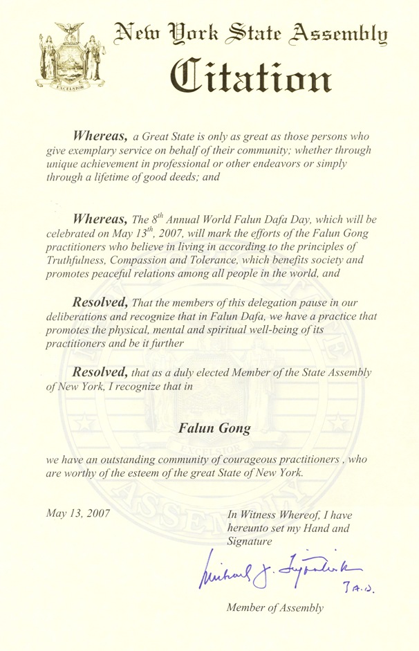 现决定,作为纽约州一名通过正式选举产生的州议员,我褒奖