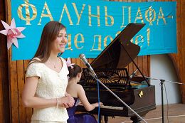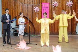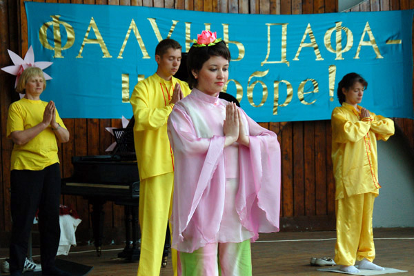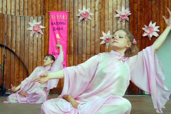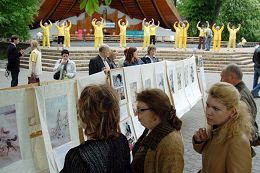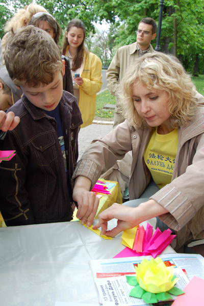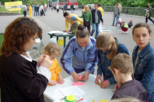 法轮功学员们除了演示功法外,还歌唱、跳舞、诗歌、钢琴等表演欢庆节日。现场展示了法轮功学员的画作,并且教小朋友叠纸莲花,吸引了许多乌克兰民众。
