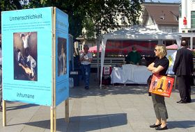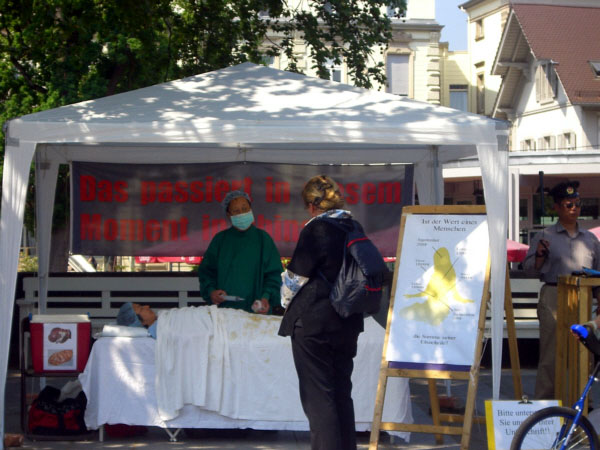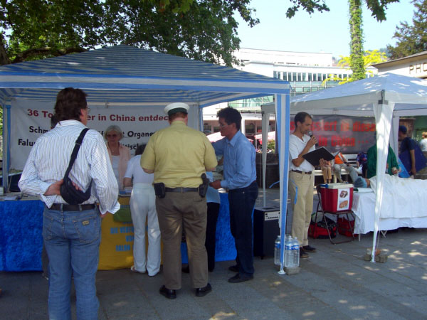一位值勤的德国警察来到台前,他仔细倾听详尽了解了发动迫害者的桩桩罪行,最后腋下夹着一打真相资料离开。法轮功学员米歇尔(Michael)则手持话筒,通过扩音器,向过路的市民讲述中共当局是如何残忍血腥、丧失人性的对待那些探求高尚价值、信仰真善忍的中国人民。