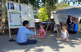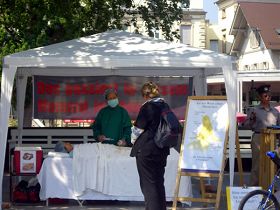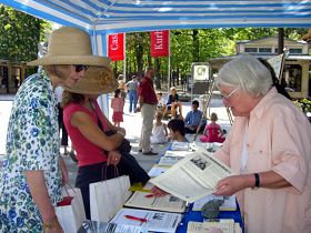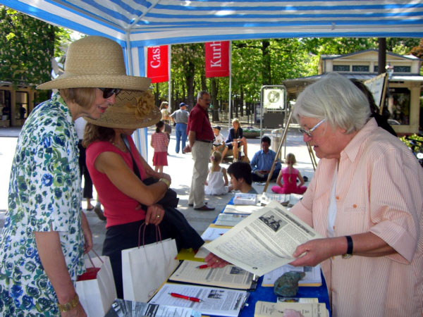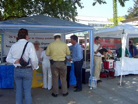 ![]() 两位德国女士来到信息台前要签名声援中国的法轮功修炼者们,法轮功学员鹿特(Ruth)女士正在为她们介绍征签簿上的背景内容。 |