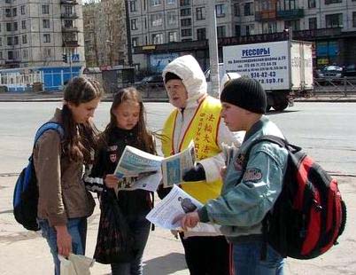 一位知识份子模样的男子开始带着疑惑,久久的看着横幅和资料,向法轮功学员们提了很多问题,最后说:现在形势很复杂,俄罗斯媒体一直都不敢真实报导法轮功,而你们却坚持讲真相,我尊敬你们的诚实和勇气。