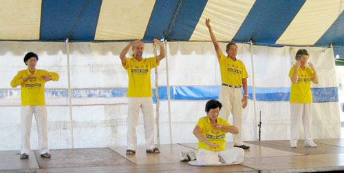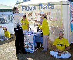 第二次参加庆典活动的法轮大法学员,在展位上为大家展示法轮功的五套功法,散发讲述法轮功在中国遭受迫害的真相资料,教人们摺叠美丽的纸莲花,以及为西方朋友用毛笔写他们的中文名字。